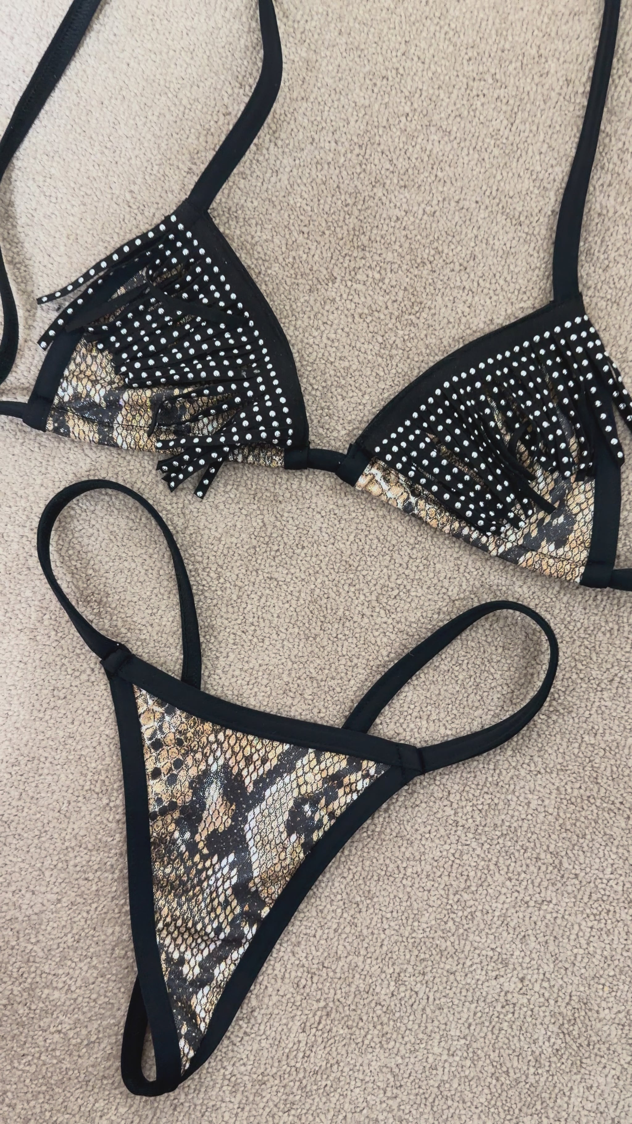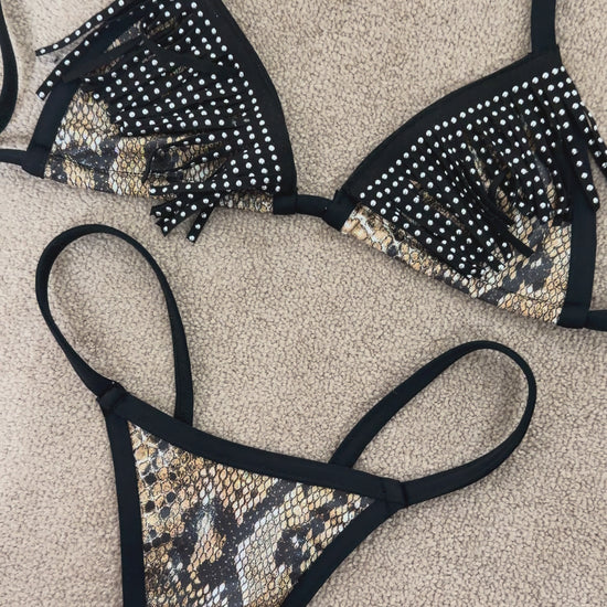 Snake bikini with black fringe on the top! This bikini features leopard fabric and black trim. Model is wearing size small/medium